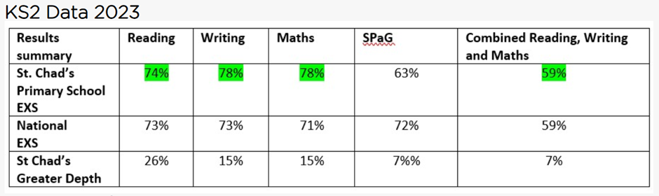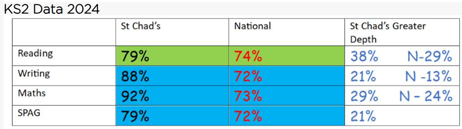 We are proud of the progress and achievements of every child at St Chad’s. Through high expectations and consistent effort from both pupils and staff, our overall outcomes are in line with national averages, and we are delighted that writing continues to exceed national performance